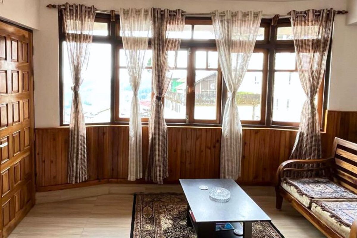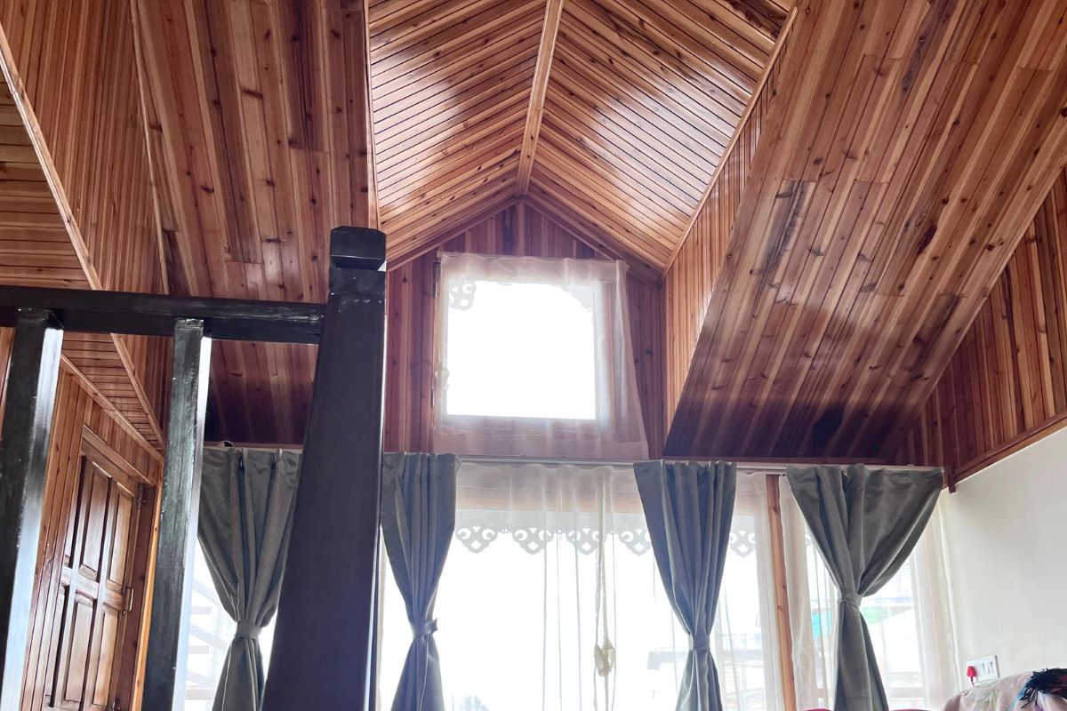 Experience a cozy wooden duplex stay with warm interiors, large windows, and beautiful mountain surroundings.